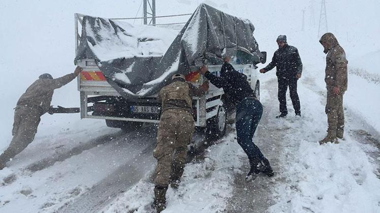 Hakkari'nin Yüksekova ilçesinde etkili olan kar yağışı ve buzlanma nedeniyle zor anlar yaşayan araç sürücülerinin yardımına askerler koştu. Askerler, yokuş yukarı çıkmakta zorlanan araçları itti.