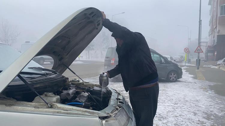 Soğuk hava sebebiyle araçları donan sürücüler zor anlar yaşadı. Otomobilinin aküsü donan Erkan Akbulak, akü ve yakıt tankına sıcak su dökerek, aracını çalıştırmayı başardı.