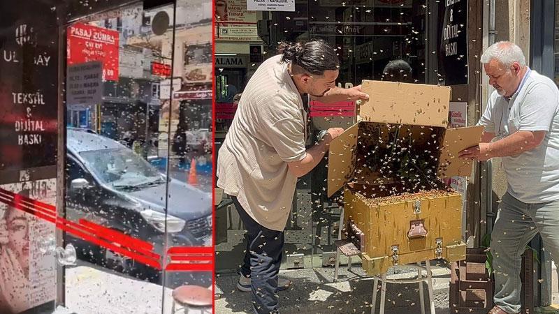 Esnafının haber verdiği arıcılıkla uğraşan Hüseyin Savcı, sokağa gelerek arıları kovana aldı.
