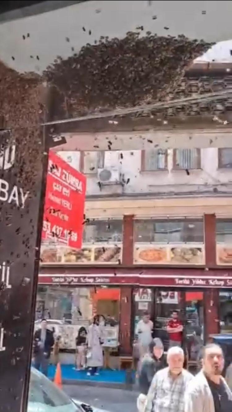 Sabah iş yerlerine gelen çalışanlar, arıları görünce sokakta beklemek zorunda kaldı.