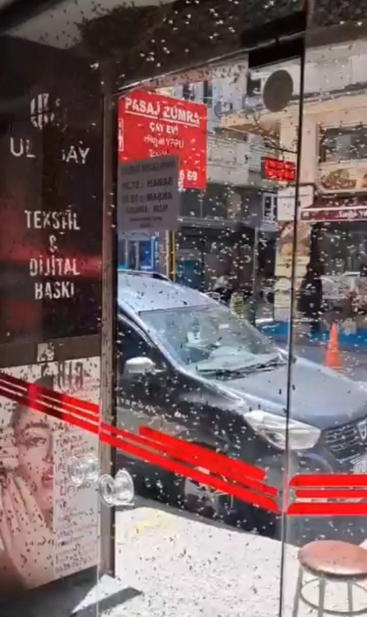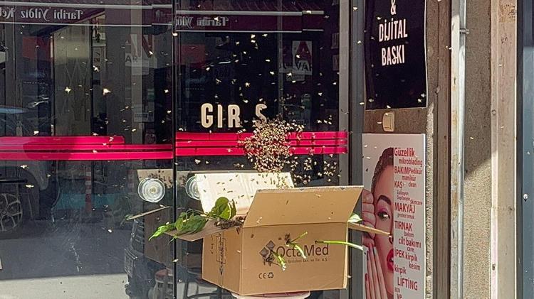 Bursa'da, bal arıları iş hanının girişine oğul verdi. Handaki iş yerinde çalışanlar, arıların kovana alınmasının ardından içeri girebildi.