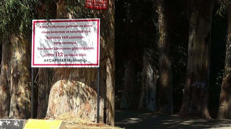 Akçapınar Mahallesi Muhtarı Şener Baykara, ağaçlara zarar verilmemesi için mahalle girişine 'Aşıklar yolumuzu gelecek nesillere miras bırakmak ve korumak için ağaçlara yazı yazmayın, zarar vermeyin.