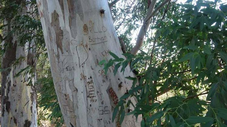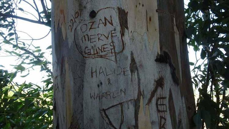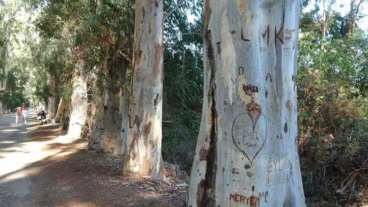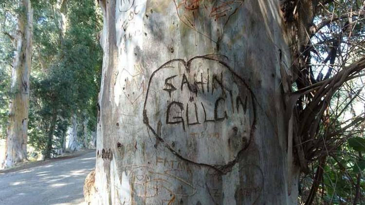 Muğla'nın Ula ilçesindeki 'Aşıklar Yolu'nda karşılıklı sıralanan 86 yıllık okaliptüs ağaçlarının yazı tahtasına çevrilince muhtarlık, çareyi mahalle giriş- çıkışına uyarıcı tabela koymakla buldu.