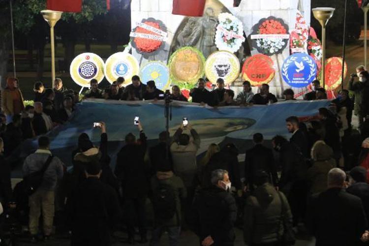 Sloganlarla, şarkılarla toplanan kalabalık anıta yürüdü.