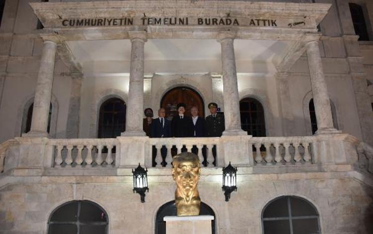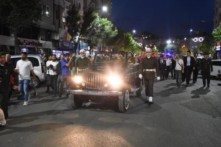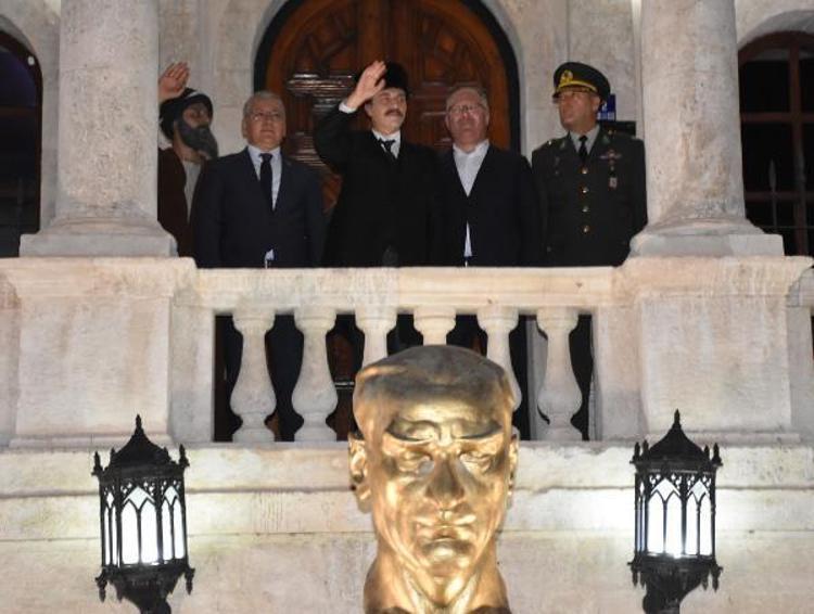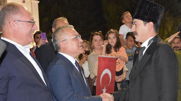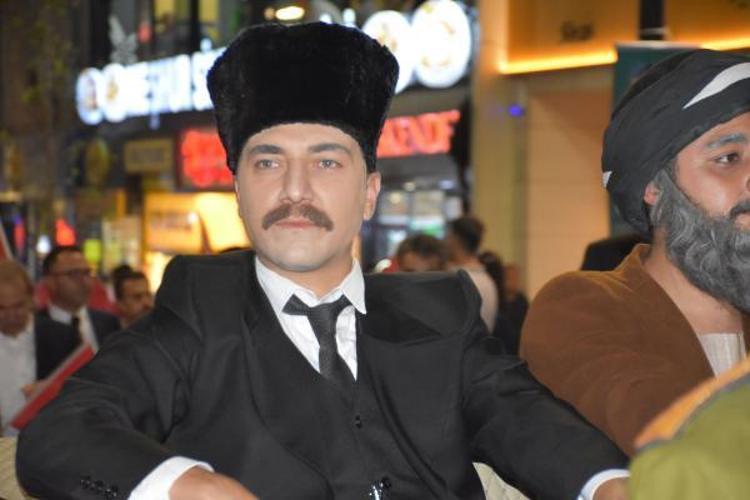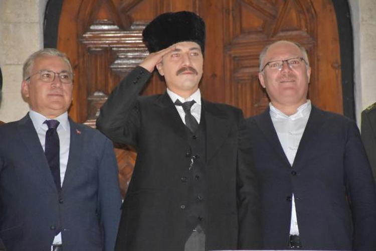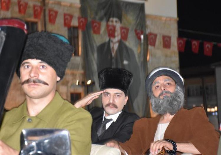 Atatürk'ü canlandıran tiyatro oyuncusu Samet Sümbül, halkı selamladıktan sonra kent meydanında Vali Yılmaz Şimşek, Belediye Başkanı Hilmi Bilgin ve protokol üyeleri tarafından karşılandı.