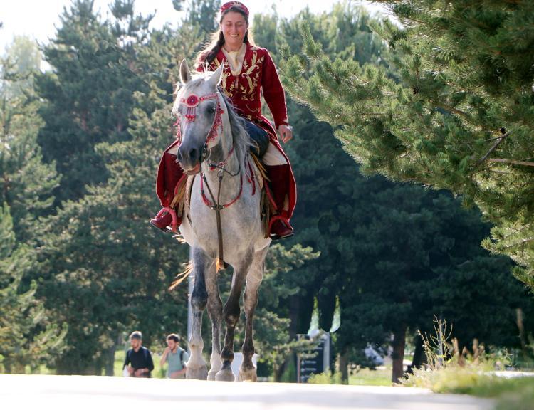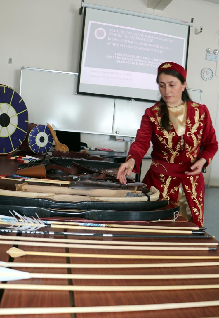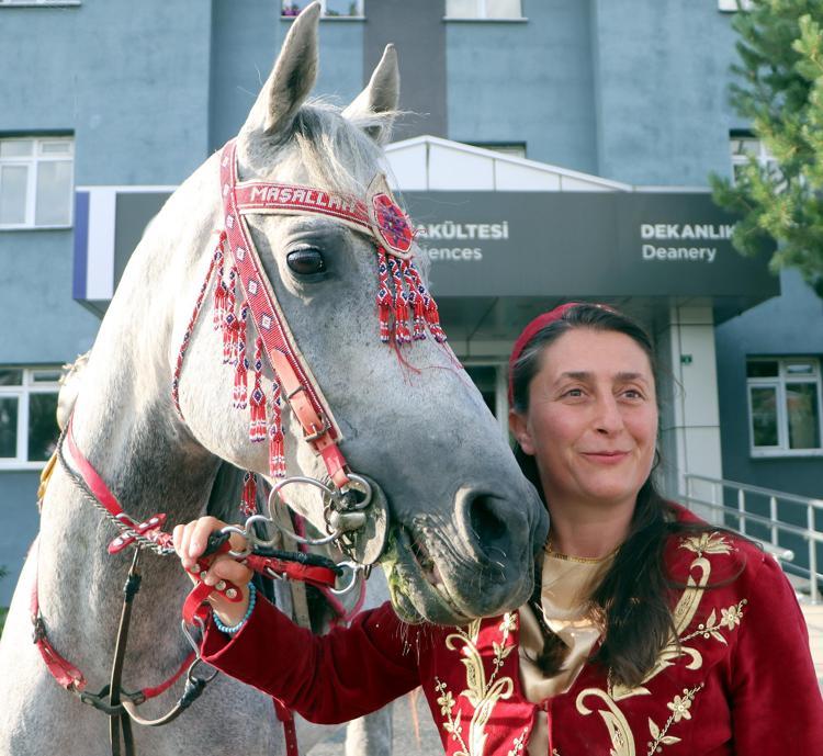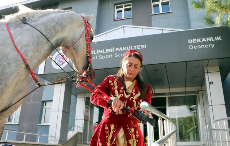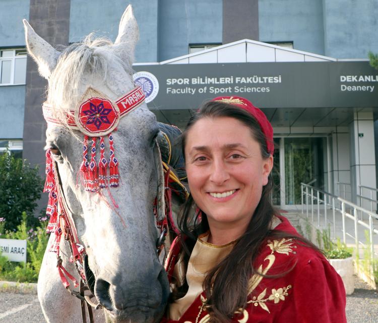 Erzurum'da Uluslararası Kadın Atlı Okçuluk Dünya Şampiyonu Ayşe Melek Okuyucu (42), geleneksel atlı okçuluk sporcularının stresle başa çıkma tarzları ile kişilikleri arasındaki bağlantıyı bulma amaçlı hazırlığı tezini, eğitim gördüğü Atatürk Üniversitesi Spor Bilimleri Fakültesi'ne atı 'Gardaş'a binerek götürdü.