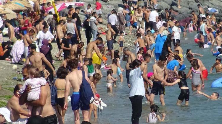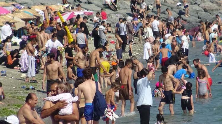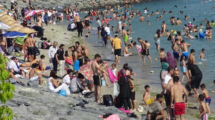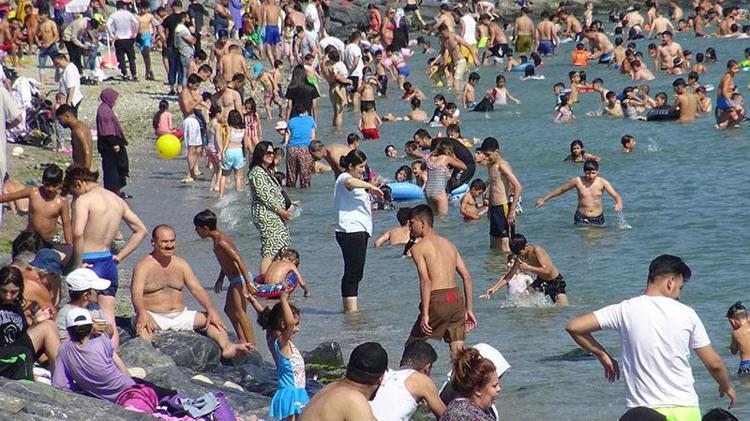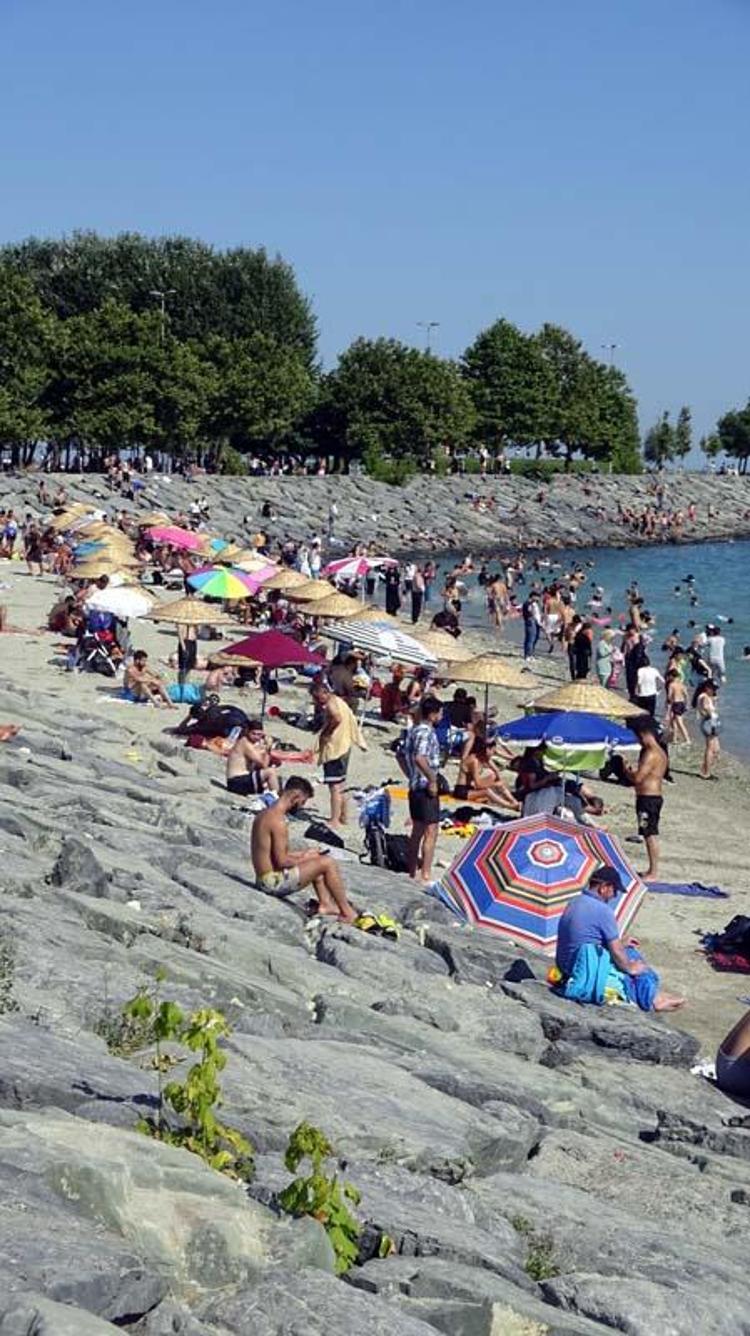 Sıcaktan bunalanlar Avcılar Sahili'ne akın ederken kumsal kesimde neredeyse ayak basacak yer kalmadı.