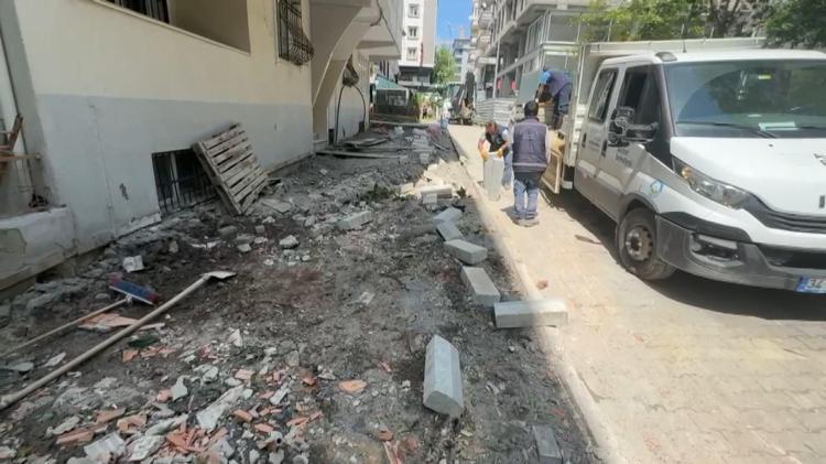 Belediye ekipleri, çöken kaldırımın olduğu bölümde dolgu ve yeniden düzenleme çalışması yaparken, bina girişinin de yapımına başlandı.