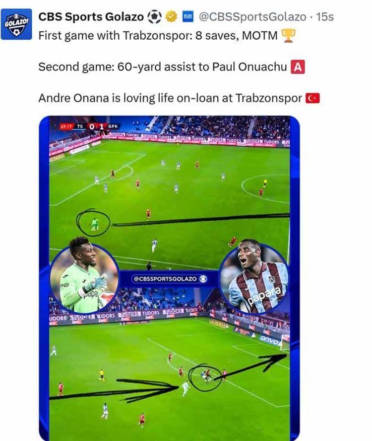 Football Tweet: “Türkiye’de Andre Onana, Trabzonspor için asist yaptı.”