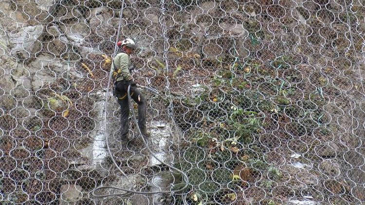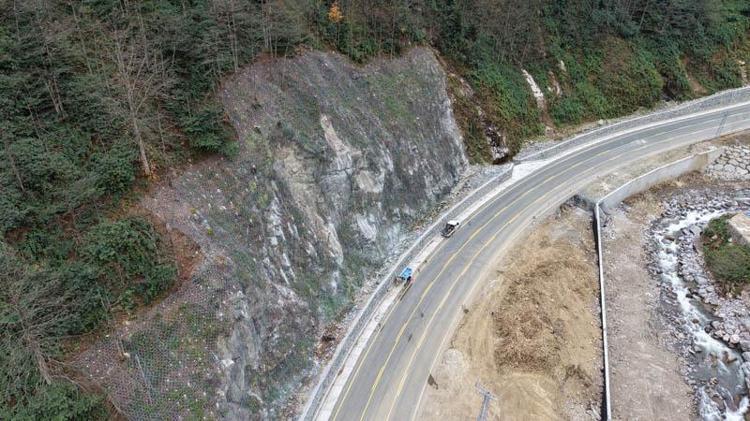 18 kilometrelik yolda heyelan ve kaya düşme riski olan yamaçlarda endüstriyel dağcılar tarafından çelik örgü ağ geriliyor. Yamaç arazide 10 kişilik ekipler tarafından örülen ağla, taş düşme riskinin önüne geçilmesi hedefleniyor. Bölgede güvenlik önlemi alarak metrelerce yüksekte sürücüler için güvenli geçiş sağlanması için yürütülen çalışmalar dron kamerasıyla görüntülendi.