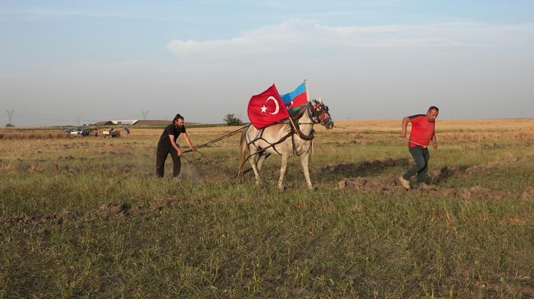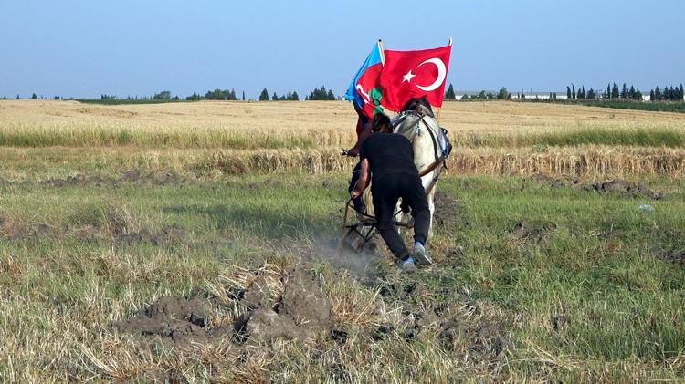 Evrensekiz beldesinde yaşayan Burak Tunçkol, dizi oyuncusu Melikşah Özen ile Azerbaycan'ın milli gününü kutlamak için çalışma başlattı. At ve kara saban kullanan Tunçkol ile Özen, 8 saat süren çalışmayla tarlaya, 'Can Azerbaycan Milli Kurtuluş Günün Kutlu Olsun" yazısını yazdı.