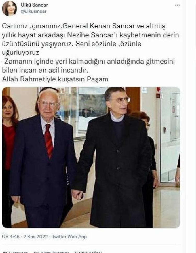 "Canımız, çınarımız, General Kenan Sancar ve altmış yıllık hayat arkadaşı Nezihe Sancar'ı kaybetmenin derin üzüntüsünü yaşıyoruz.