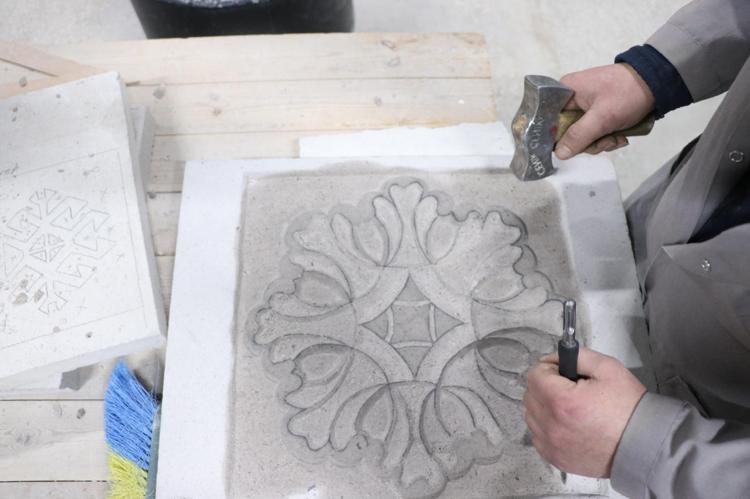 Baba-oğul, tarihi Rum Yetimhanesi'nin bahçesinde kurulan atölyede taşa şekil veriyor