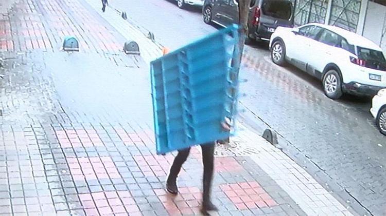 Banda boyunlukla yüzünü gizleyen şüpheli, çevredekilere aldırış etmeden yaklaşık 50 kilogram ağırlığındaki demir kapının bir kısmını söküp, kucaklayarak taşıdı.