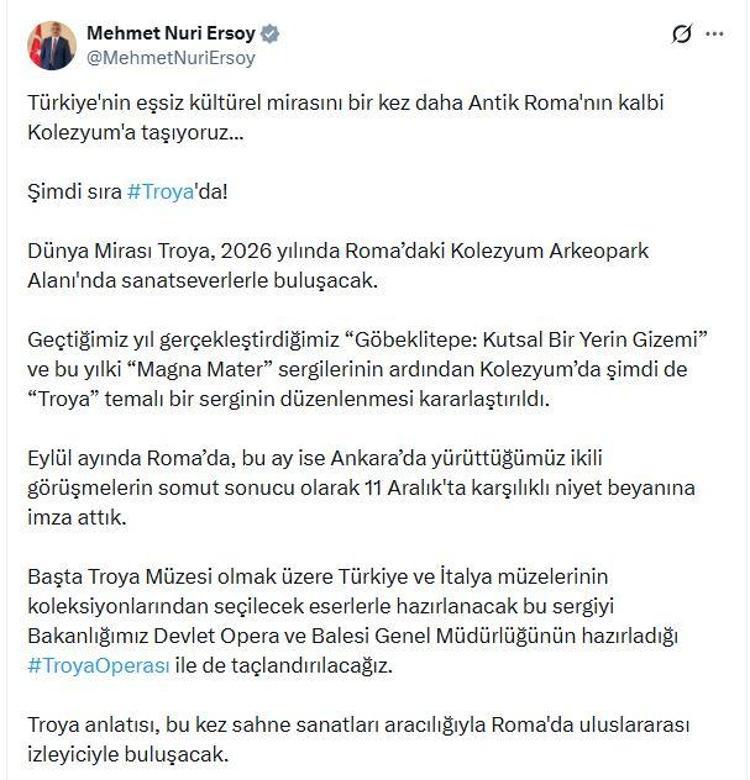 Kültür ve Turizm Bakanı Mehmet Nuri Ersoy, "Türkiye'nin eşsiz kültürel mirasını bir kez daha Antik Roma'nın kalbi Kolezyum'a taşıyoruz. Dünya mirası Troya, 2026 yılında Roma'daki Kolezyum Arkeopark Alanı'nda sanatseverlerle buluşacak" dedi.