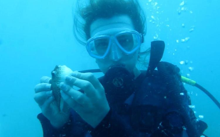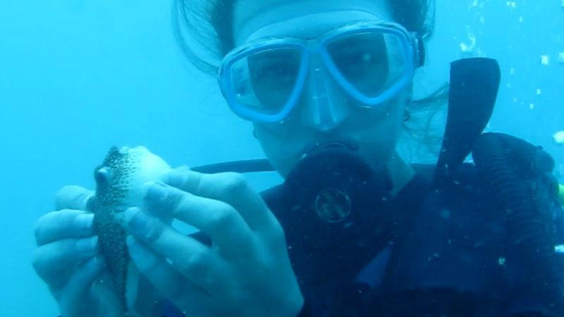 Akdeniz Üniversitesi Su Ürünleri Fakültesi'nden Prof. Dr. Mehmet Gökoğlu ve öğrencileri, yaptıkları dalışta boyutları küçük olduğu için sevimli görünen bir balon balığı türünü görüntüledi.