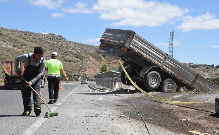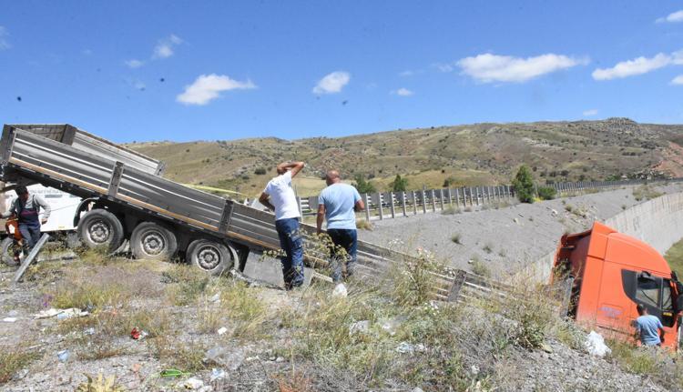 Durmuş Sağır (63) yönetimindeki 58 BG 680 plakalı beton blok yüklü TIR, bariyerlere aşıp, yaklaşık 10 metre yüksekliğindeki istinat duvarına metreler kala toprağa saplandı.