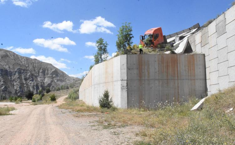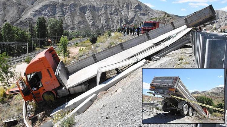 Sivas'ta kontrolden çıkan beton blok yüklü TIR, bariyerleri aşıp, 10 metre yüksekliğindeki istinat duvarına metreler kala toprağa saplandı. Kazada sürücü yaralandı.