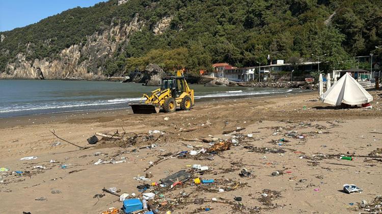 İş makinası kumsalda bulanan çöpleri alarak, kamyona yükledi. Temizleme çalışmasının yarın da devam edeceği öğrenildi.