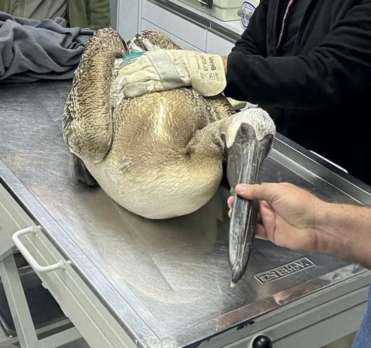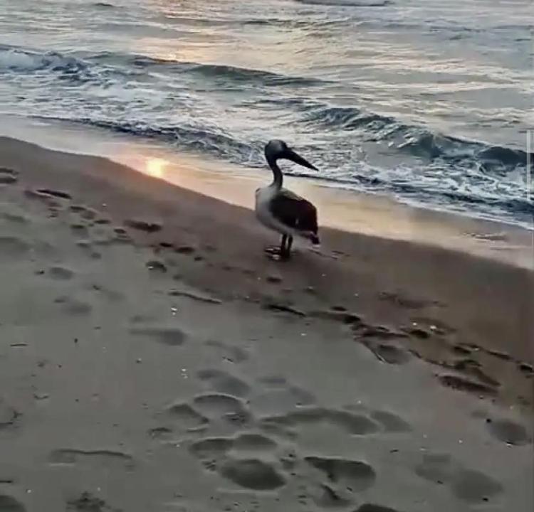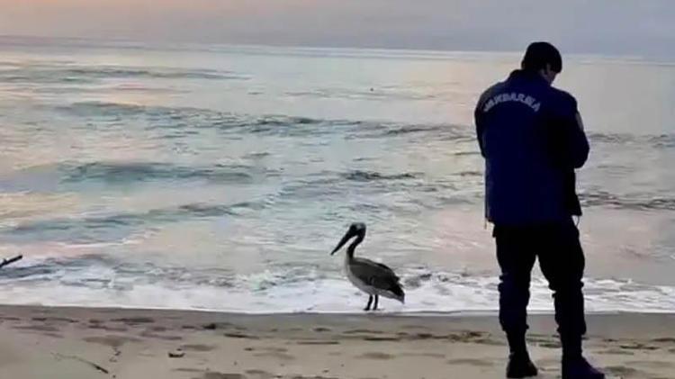 Bartın'ın İnkumu sahilinde görülen pelikan, veteriner muayenesi sonrası yeniden sahile bırakıldı. Göç rotası olmamasına rağmen yönünü şaşırıp sahile indiği belirtilen pelikan cep telefonuyla görüntülendi.