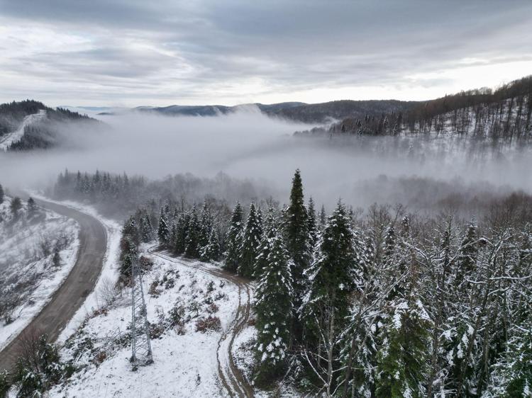 Bölgede kar kalınlığı 10 santime ulaştı. Karayolları ekipleri kar küreme çalışması yaparak yolu ulaşıma açık tuttu. Bölgedeki kar ve sis manzarası, dronla görüntülendi.
