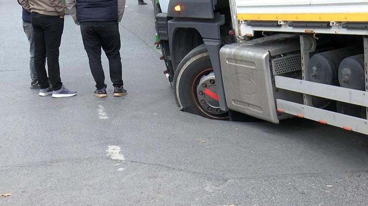 Başakşehir'de asfalt çöktü; kamyonun tekerleği çukura düştü