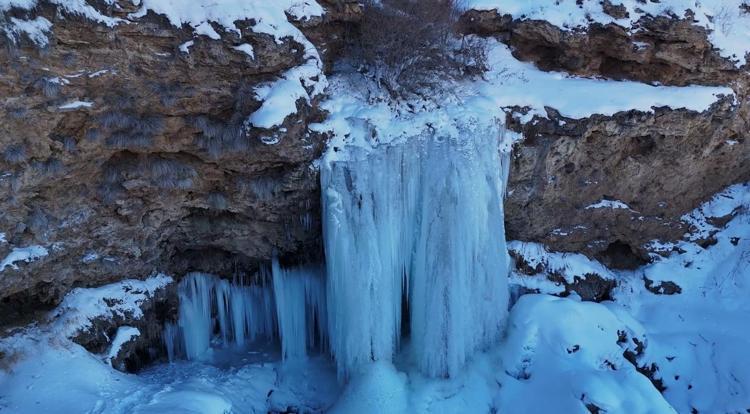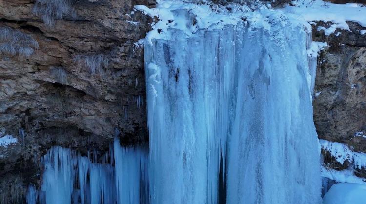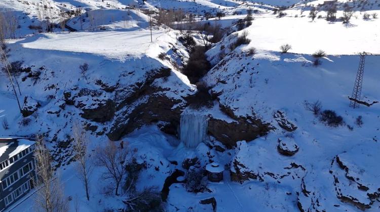 Donan şelalede, boyları 10 metreyi aşan buz sarkıtları oluştu. Bazı doğaseverler buzla kaplanan şelaleyi fotoğraflarken, güzel manzara dronla görüntülendi.