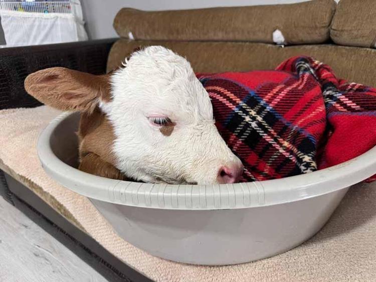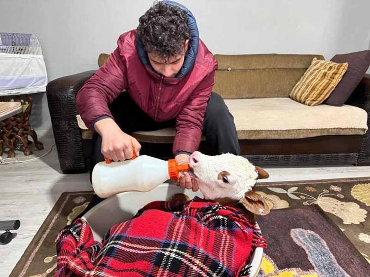 ‘Bayram’ ismini verdiği buzağıya üşümesin diye evde bakıyor
