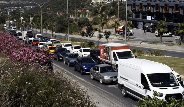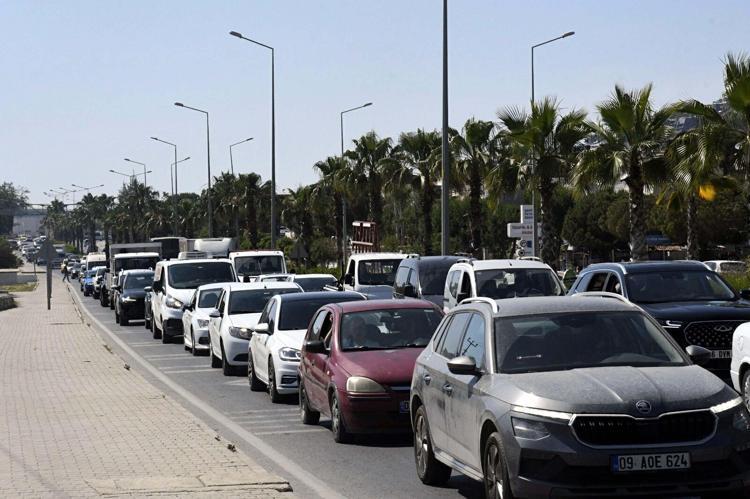 Aydın'ın Kuşadası ilçesine 24 saatte 60 binden fazla araç giriş yaptı. Tatilci akınına uğrayan ilçedeki kilometrelerce araç kuyruğu, dronla görüntülendi.