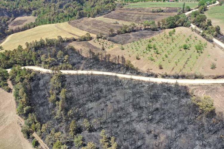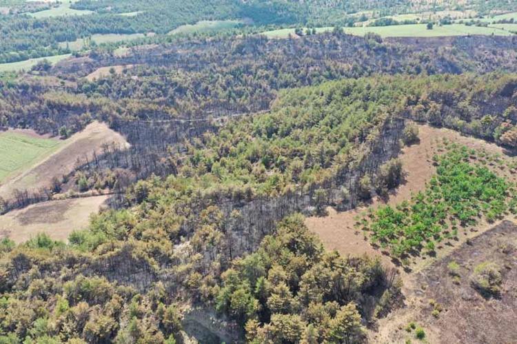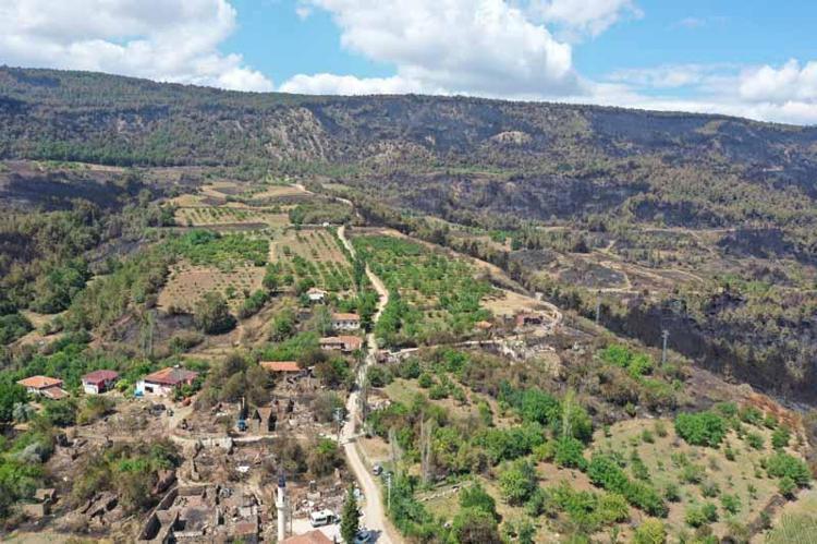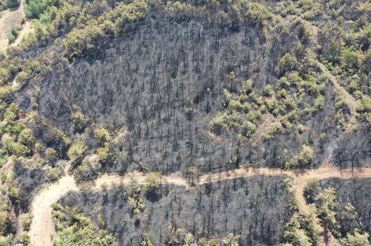 Bilecik’in Gölpazarı ve Osmaneli ilçelerinde yaklaşık 35 kilometrekarelik alanda etkili olan ve ekiplerin müdahalesiyle kontrol altına alınan yangında yanan alanlar dron ile görüntülendi.