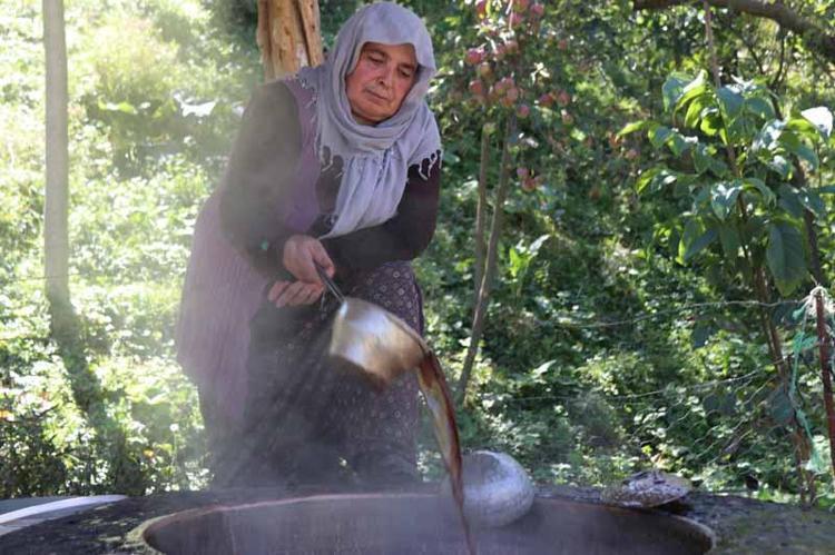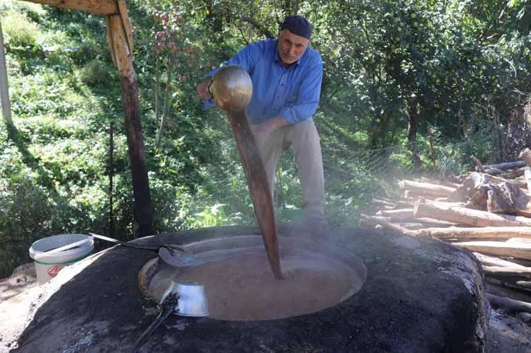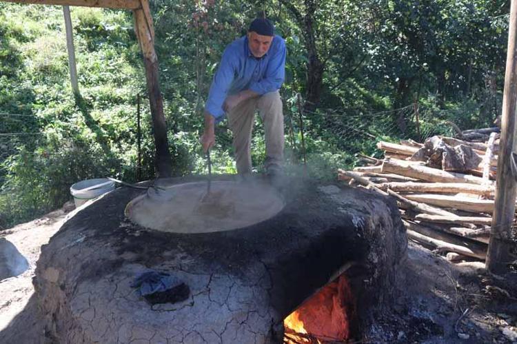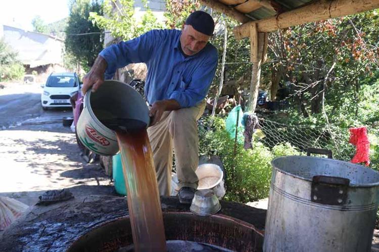 Toplandıktan sonra çöplerinden ayrılan siyah ve beyaz üzümler ezilerek suyu çıkarılıyor. Daha sonra evlerin bahçelerine kurulan dev kazanlarda, üzümler odun ateşinde kaynatılarak doğal pekmez elde ediliyor.