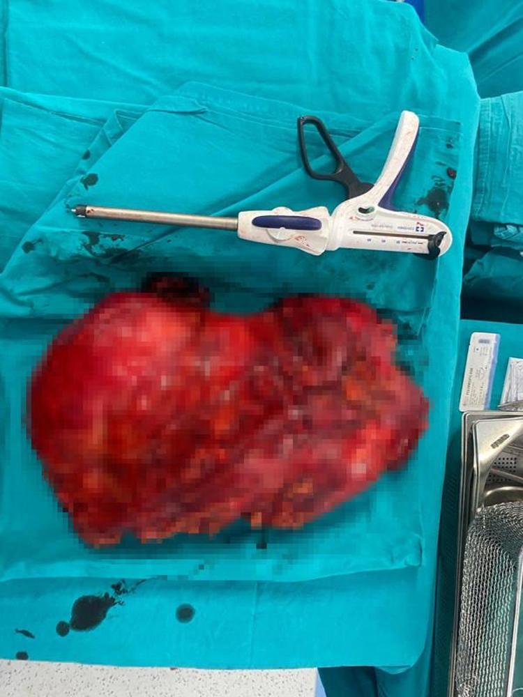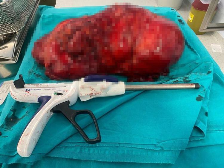 "Tümör ile bu organları çıkardık. Aynı zamanda tümörün içinden altından giden önemli damarı koruyarak geride hiç tümör dokusu bırakmadık. Tümörü çıkardık ve tartıp 8 kilo ağırlığında olduğunu gördük. Hastamızın bu ameliyatla yaşam süresini uzatma olasılığını sağladığımız için gururluyuz. Bu kitle karnın arka tarafında yer aldığı için büyük boyutlara gelene kadar kendini göstermemiş ve hastada herhangi bir şikayet olmamış. Hastanın genç olması bu şişkinliği önemsememesine neden olmuş. Daha sonra organlarına bası yapması sonucu şikayetlerin başlaması üzerine tetkik için doktora gidip hastalığı tesadüfen ortaya çıkmış."