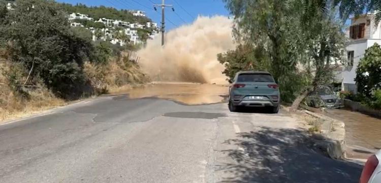 Muğla’nın Bodrum ilçesinde, ana su isale hattında meydana gelen patlama nedeniyle tonlarca su boşa aktı. Bazı evlerin bahçeleri sular içerisinde kalırken, yol araç trafiğine kapandı. Patlama anı cep telefonu kamerasına yansıdı.