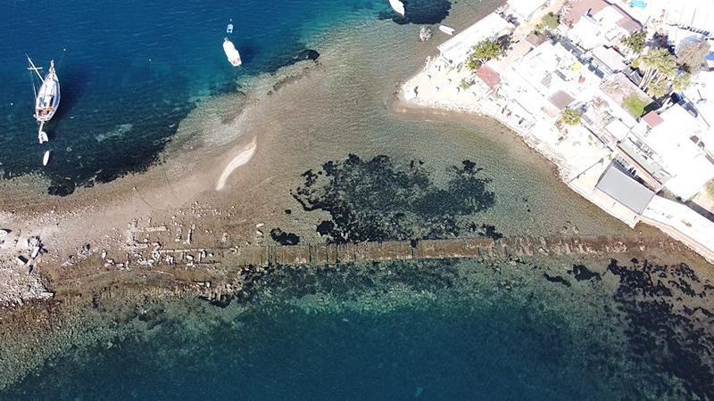 Muğla'nın Bodrum ilçesinde deniz suyunun çekilmesiyle 3 bin 500 yıllık Myndos kentine giden 'Kral Yolu', gün yüzüne çıktı. Yılın bu zamanlarında ortaya çıkan yol, dronla havadan görüntülendi.