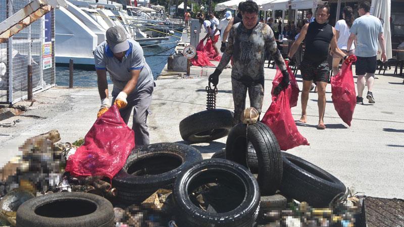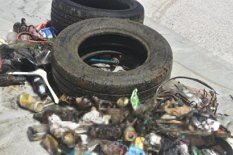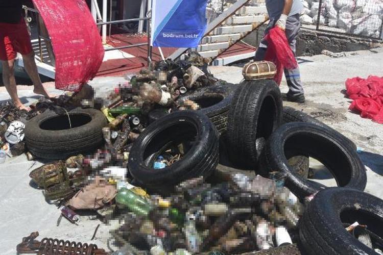 Denizden araç lastiği, cam ve pet şişeler ile cep telefonunun da olduğu 500 kilo atık çıktı.