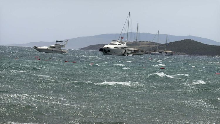 Muğla'nın Bodrum ilçesinde fırtına nedeniyle 10 tekne sürüklenip karaya oturdu, İstanköy feribot seferleri iptal edildi.