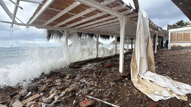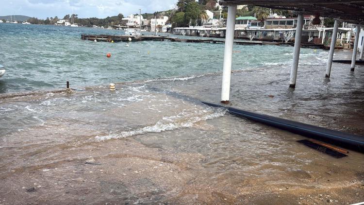 Muğla'nın Bodrum ilçesinde, etkili olan fırtına nedeniyle işletmelerin camları kırıldı, iskeleler söküldü, dalgaların etkisiyle deniz taştı.