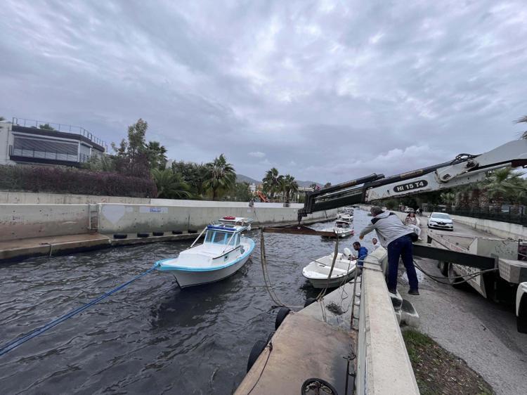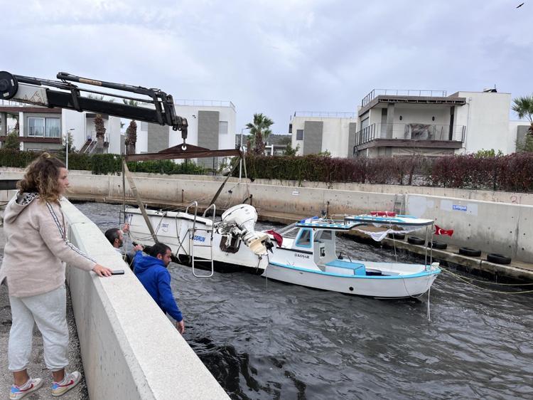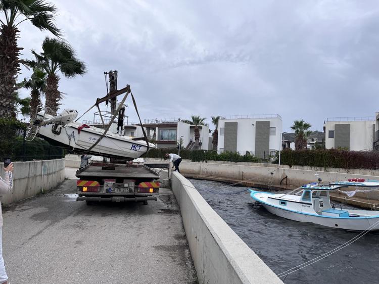 Yan yatan yelkenli tekne için kurtarma çalışması başlatıldı. Ortakent'te hasar alan 2 balıkçı teknesi ise vinçle karaya çıkarıldı.