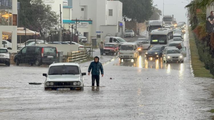 Muğla'nın Bodrum ilçesinde, kuvvetli sağanak yaşamı olumsuz etkiledi. Cadde ve sokaklar göle döndü, araçlar yolda mahsur kaldı. Sürücüler zor anlar yaşadı.