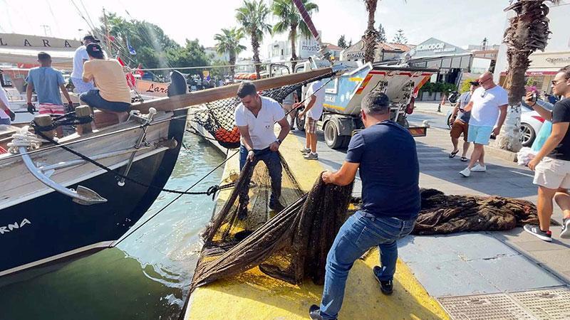 Muğla'nın Bodrum ilçesinde 'Aksona Mehmet' olarak tanınan bölgenin son süngercisi olduğu belirtilen Mehmet Baş (74) ile ekibi, deniz dibinden 500 metrekare büyüklüğünde hayalet ağ çıkardı.