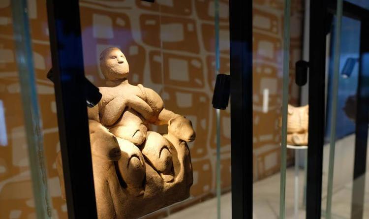 2’nci sergi salonumuzda bir animasyonumuz var ve ziyaretçilerimizi günümüzden 9 bin yıl öncesine götürüyoruz. Duvar resimleri, Anadolu parsı, su kuşları gibi dünyanın en eski şehir planını duvarlarına işliyorlar bu en etkileyici buluntu. Leoparlarla oturan kadın, yaşam ve ölüm figürünü, insan yüzlü çanak, güzellik ve estetiğe değinecek olursak kemikten kolyeler, yüzükler, çakmak taşından kama, obsidyenden yapılmış dünyanın en eski ayna örneklerinden birini burada birebir kopyasını sergiliyoruz.” dedi