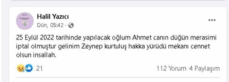 Halil Yazıcı sosyal medyada, "25 Eylül 2022 tarihinde yapılacak oğlum Ahmet Can Yazıcı'nın düğün merasimi iptal olmuştur. Gelinim Zeynep Kurtuluş Hakk'a yürüdü. Mekanı cennet olsun inşallah" paylaşım yaparak duyurdu.