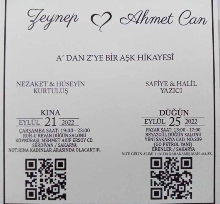 Adapazarı Karakamış Mahallesi'nde yaşayan Zeynep Kurtuluş ile Ahmet Can Yazıcı hayatlarını birleştirme kararı aldı. Zeynep ve Ahmet Can hazırlıklarını yaparak düğün davetiyelerinde 'A'dan Z'ye bir aşk hikayesi' ifadesini kullandılar.