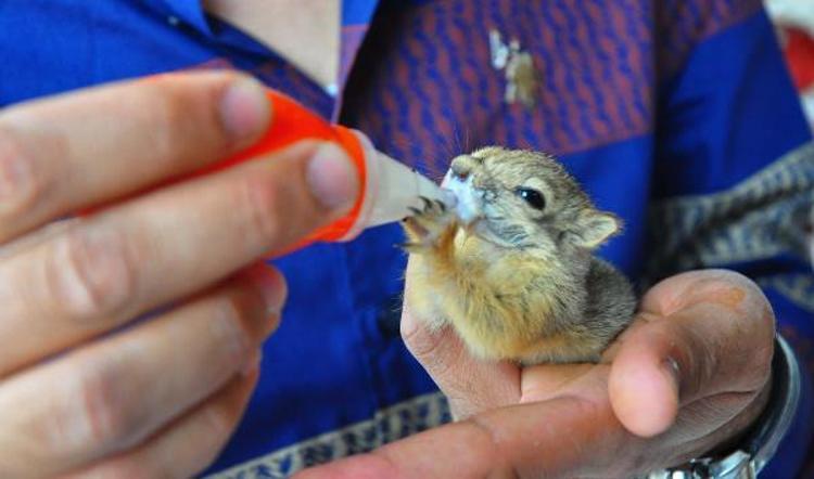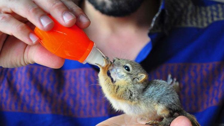 Kaya, hava kararınca sincabı alarak evine götürdü. Yavru sincabı sahipleren ve beslenmesi hakkında araştırma yapan Kaya, biberona doldurduğu süt ile besliyor.
