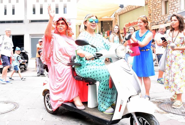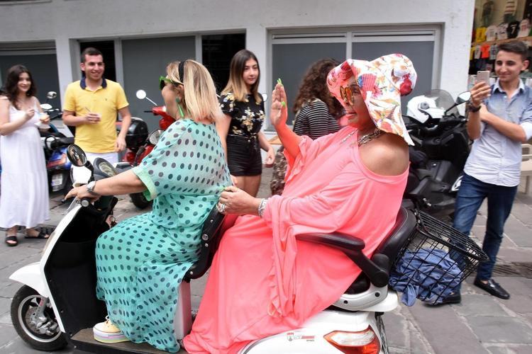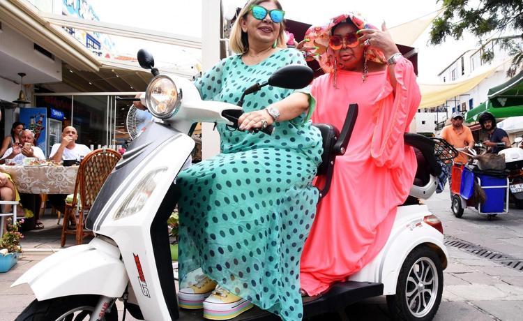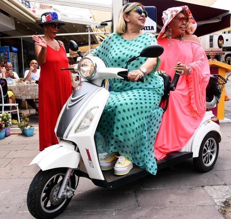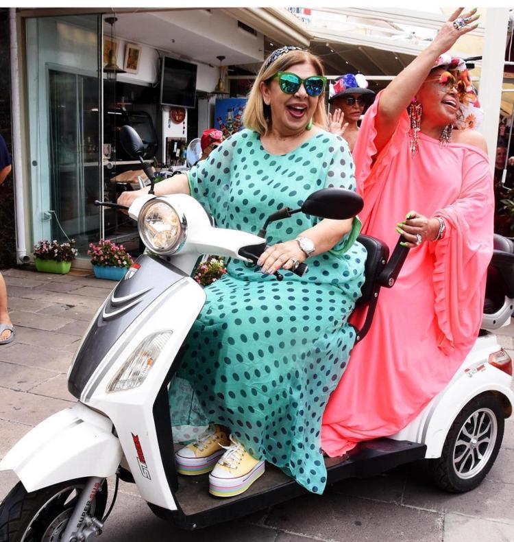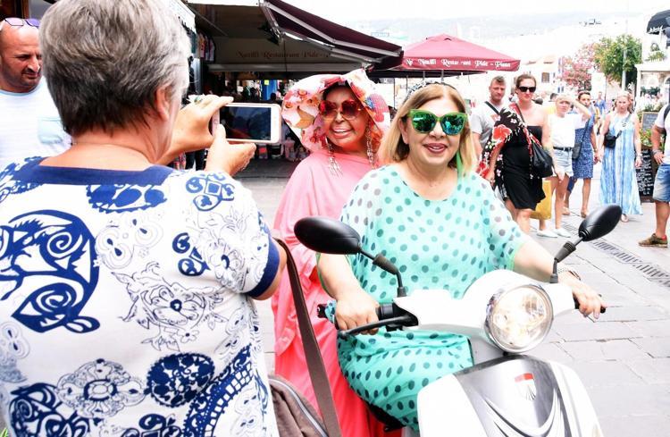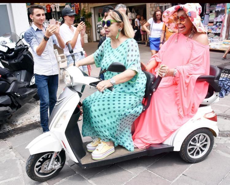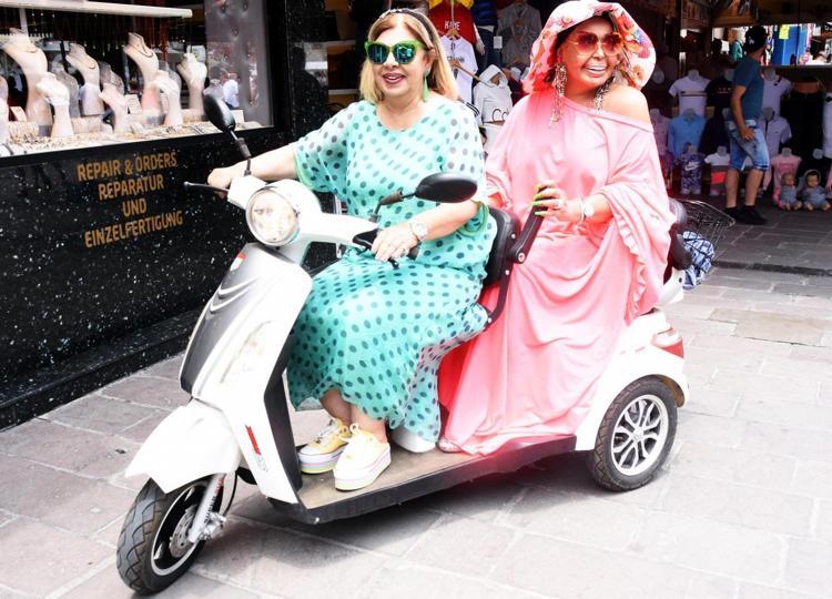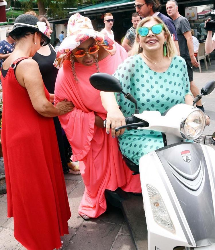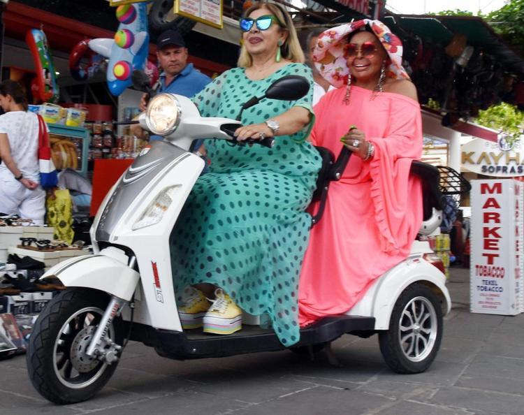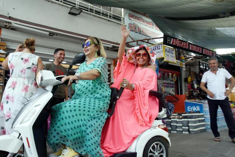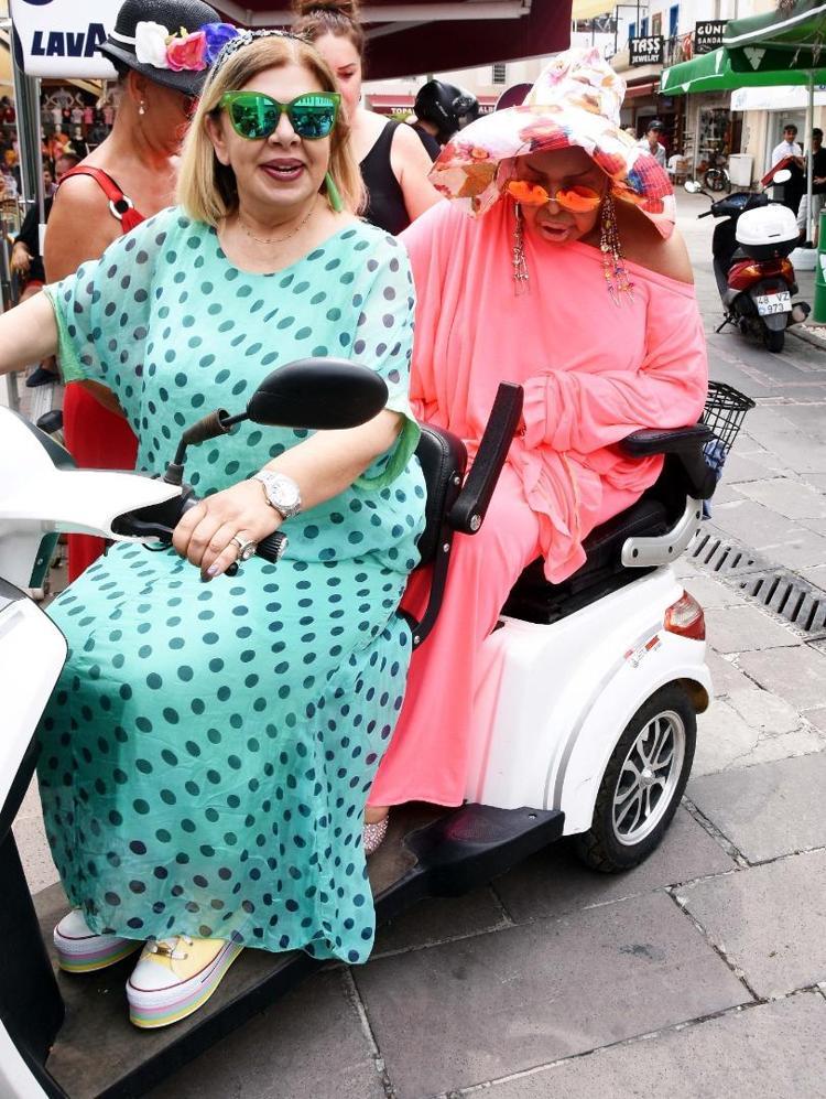 Arkadaşı Serpil Benay'ın kullandığı üç tekerlekli elektrikli motosikletin arkasına oturan Bülent Ersoy, Bodrum Çarşısı'nda gezdi.
