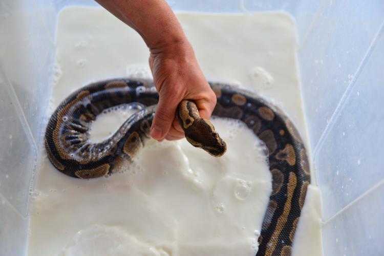 Dünya Doğayı ve Doğal Kaynakları Koruma Birliği'nin (IUCN) nesli tükenme tehlikesi altında bulunan türler arasında gösterdiği kraliyet pitonlarının deri değiştirme sürecini takip eden görevliler, yılanlara haftanın bir günü deri değiştirmelerine yardımcı olmak için süt banyosu yaptırıyor.