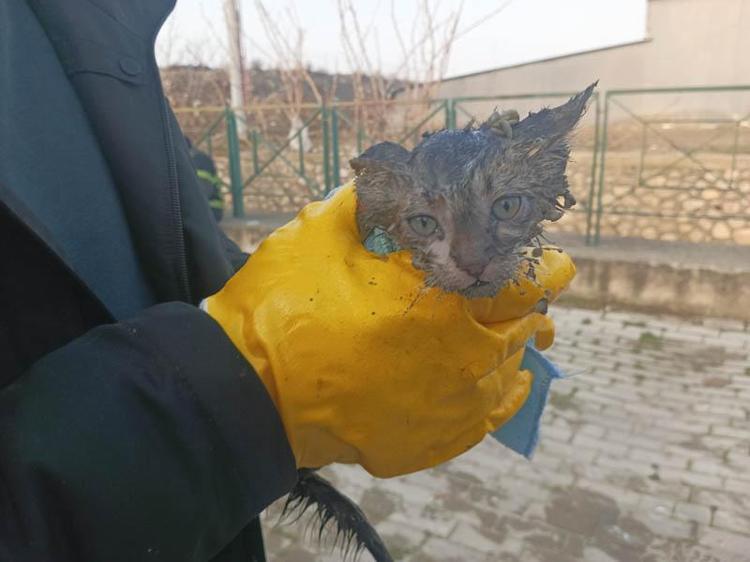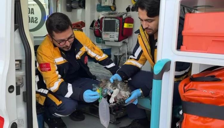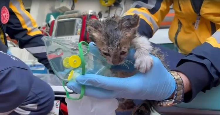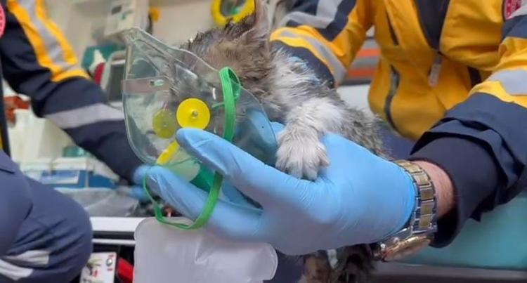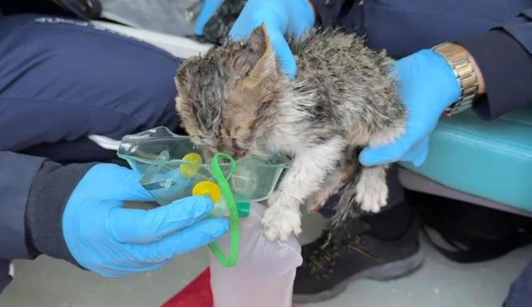 Ekipler alevlerin arasında kalan yavru bir kediyi de kurtardı. Dumandan etkilenen ve tüyleri yanan kedi, sağlık ekiplerine teslim edildi. Yavru kediye oksijen maskesiyle hava verilirken, o anlar kameraya yansıdı.