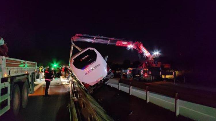 İçerisinde 47 yolcu bulunan otobüs, yan yatarak, bariyerin üzerine devrildi.