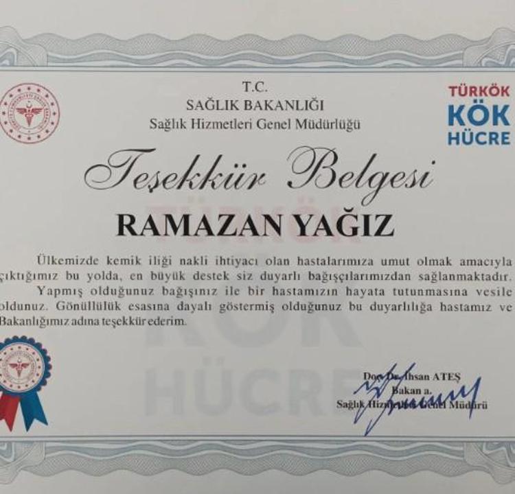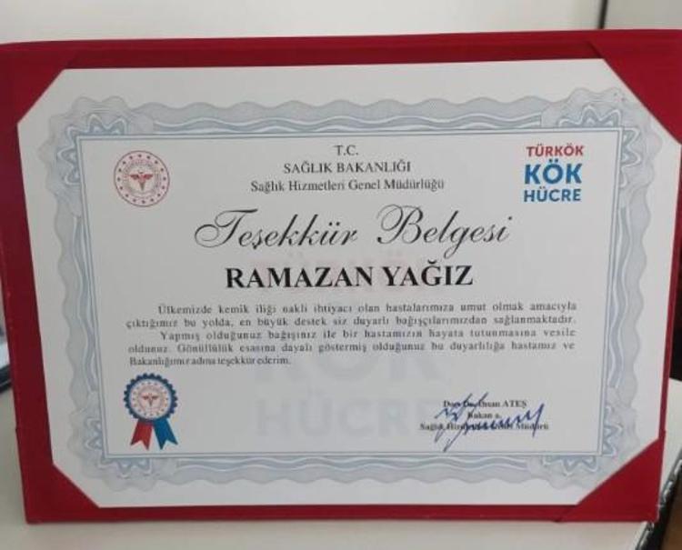 Şehit Yağız, Sağlık Bakanlığı tarafından gönderilen Teşekkür Belgesi’ni ve mutluluğunu, "Bundan yaklaşık 10 sene önce kök hücre (kemik iliği) bağışçısı olmak ister misiniz sorusuna evet dedim ve 10 yıl sonra geçtiğimiz Mart ayında kanser olan bir hasta ile uyumlu olduğum haberini aldım. Çeşitli testler sonrası Haziran ayında Ankara Bilkent Şehir Hastanesi'nde nakil gerçekleşti ve 3 ayı aşkın bir sürenin sonunda bugün hastanın taburcu olduğu bilgisini aldım. Sağlık Bakanlığı'nın aldığı karar gereği hastayı tanımıyorum ama çok mutlu oldum. Rabb’im kimseyi çaresiz dertlerle imtihan etmesin inşallah" mesajıyla sosyal medyadan paylaştığı ortaya çıktı. (DHA)