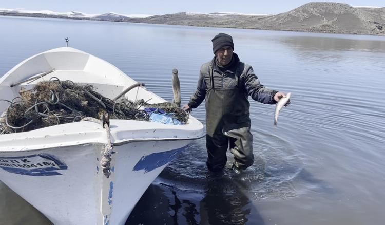 Kars'ın Arpaçay ilçesinde balıkçılar, balık avlamak için havaların ısınmasıyla birlikte buzları çözülmeye başlayan Çıldır Gölü'ne açıldı.